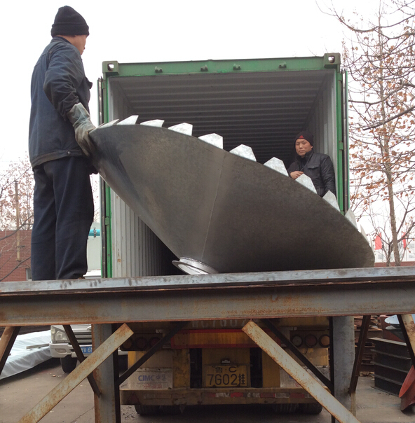 安裝時(shí),根據(jù)倉徑的大小,采用多個(gè)吊裝架,吊裝架上固定一個(gè)手動(dòng)葫蘆,使用特制的吊板用螺栓固定在倉壁墻板上,緩緩提升倉體。采取自上而下的安裝方式,即先安裝頂蓋、上層墻板,然后在裝中層墻板,再裝下層墻板,后將整個(gè)倉固定在基礎(chǔ)上。筒倉的構(gòu)件全部采用高強(qiáng)度螺栓連接,安裝方便、迅速、可靠。